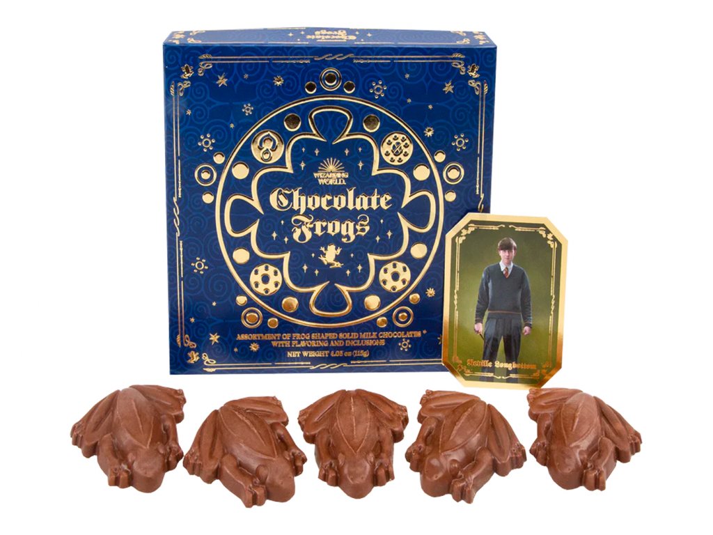 Překvapte fanouška Harryho Pottera touto krabicí lahodných čokolád ve tvaru žabek. Těchto pět žabek, vyrobených z mléčné čokolády s příchutěmi, se dodává v krásně zdobené krabičce podle původního balení z Medového ráje spolu s kartou kouzelníka. Náhodná karta čokoládové žáby obsahuje životopis postavy a obrázek, jak ji vidíme na filmovém plátně.