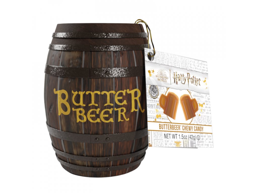 Gumové bonbóny s tvarem a chutí máslového ležáku, oblíbeného nápoje v kouzelnickém světe Harryho Pottera v kovovém barelu, který imituje masivní sud z kterého se ležák stáčí.