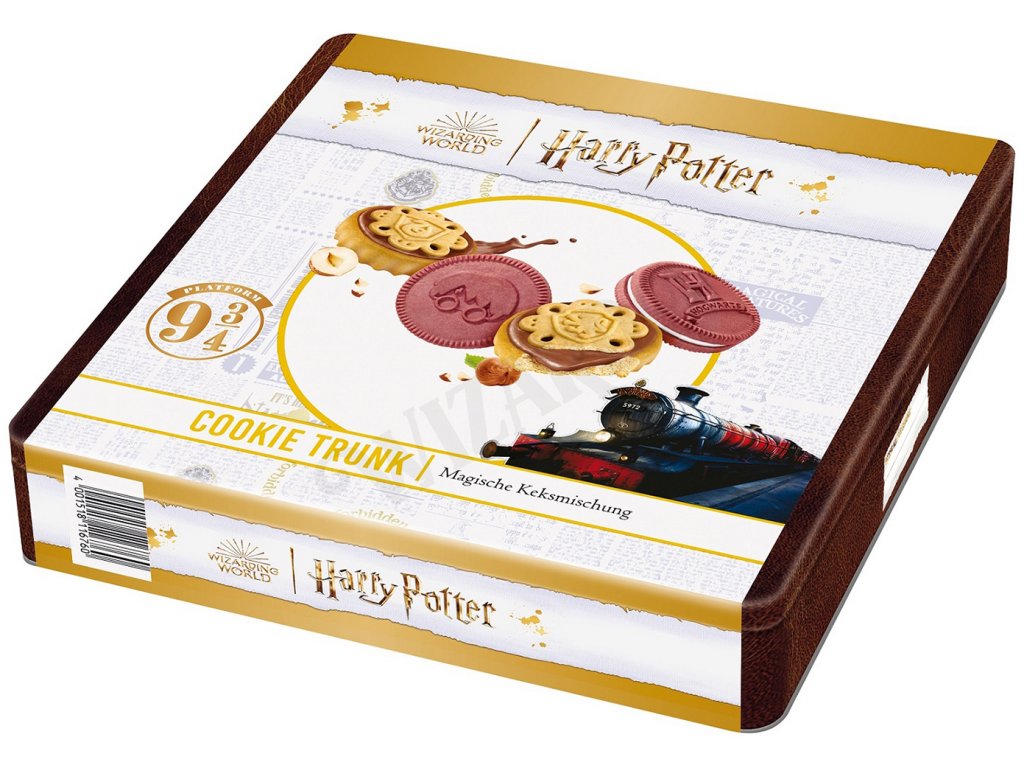 Plechová dóza v podobě bradavického kufru, který obsahuje kombinaci Bradavických sušenek 180 g, křupavých sušenek s vanilkovou krémovou náplní a Rozřazovacích sušenek 172 g s nugátovo-oříškovou náplní.