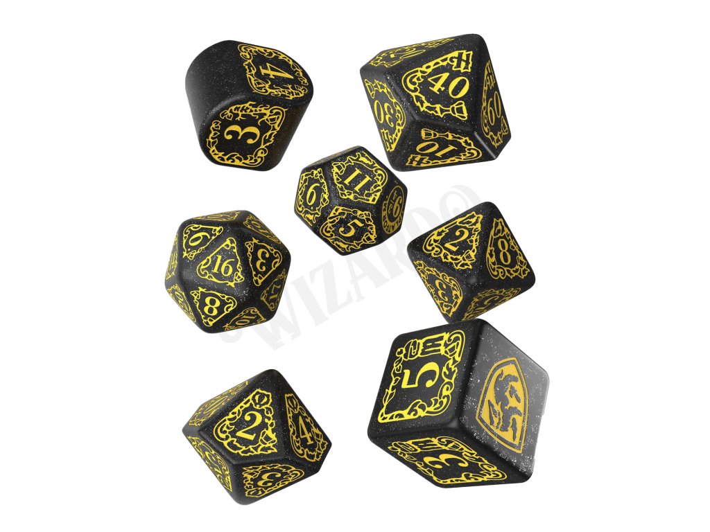 - Barevnou variantou této sady kostek je třpytivé černé pozadí a žluté rytiny.