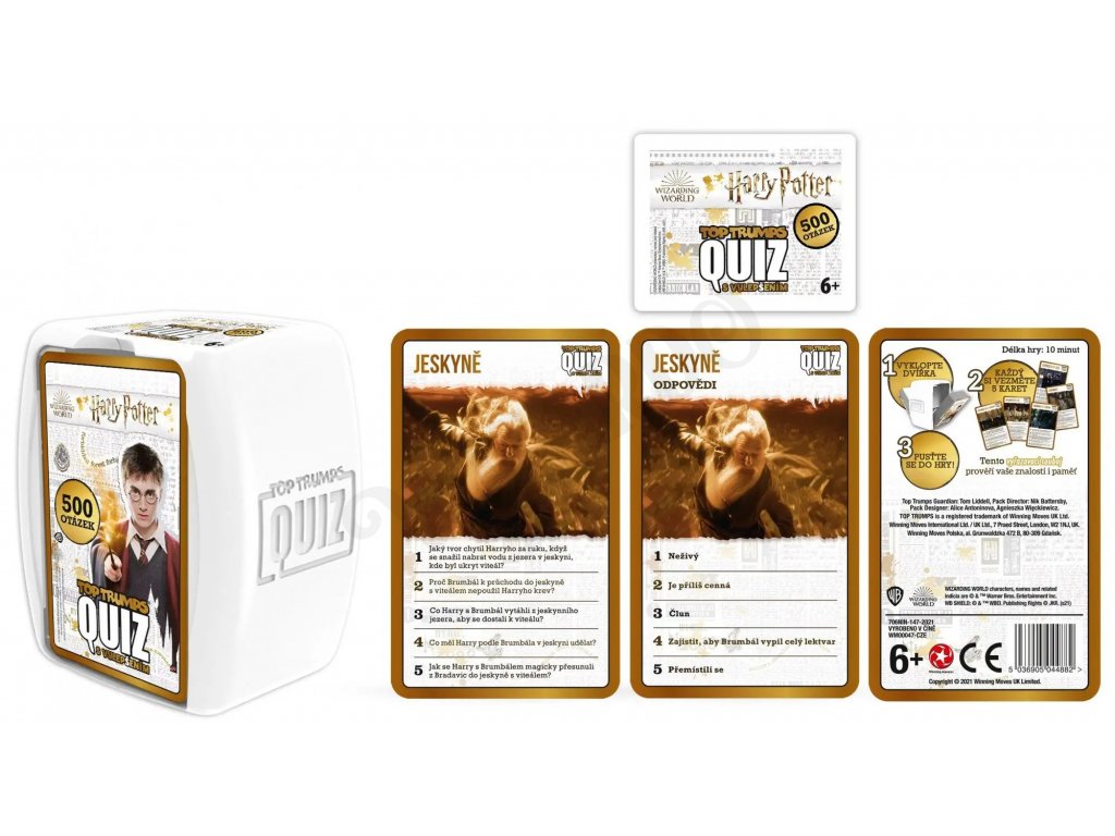 Myslíš si, že znáš dokonale Harryho Pottera a kouzelnický svět? Nyní máš šanci to dokázat kvízovou karetní hrou od TOP TRUMPS. Čeká na vás 500 otázek na 100 kartách se skvělými obrázky z fantastického světa Harryho. Dokážete odpovědět na více otázek než váš soupeř? A dokážeze si zapamatovat zajímavá fakta, která slyšeli před několika okamžiky?