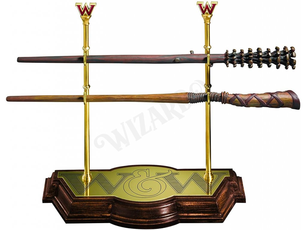Sada hůlek dvojčat Freda a George Weasleyových s elegantním dřevěným stojanem a kovovým držákem.