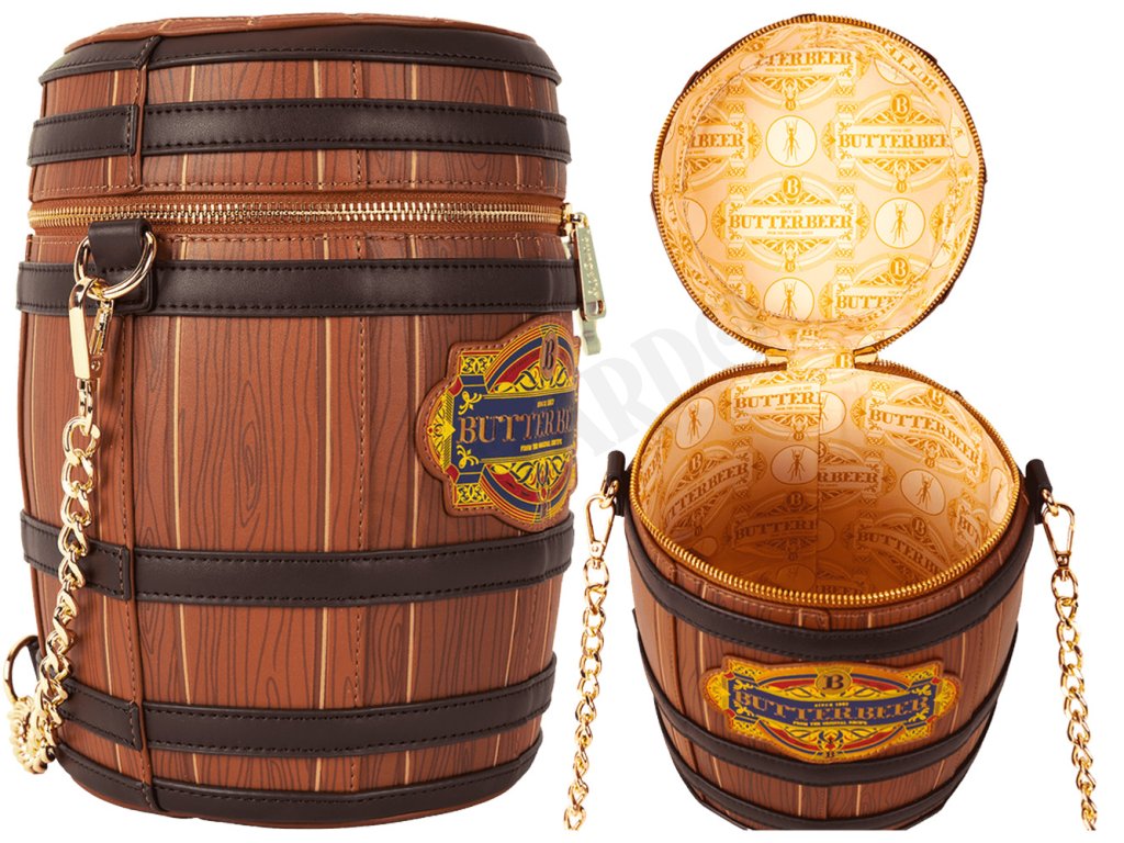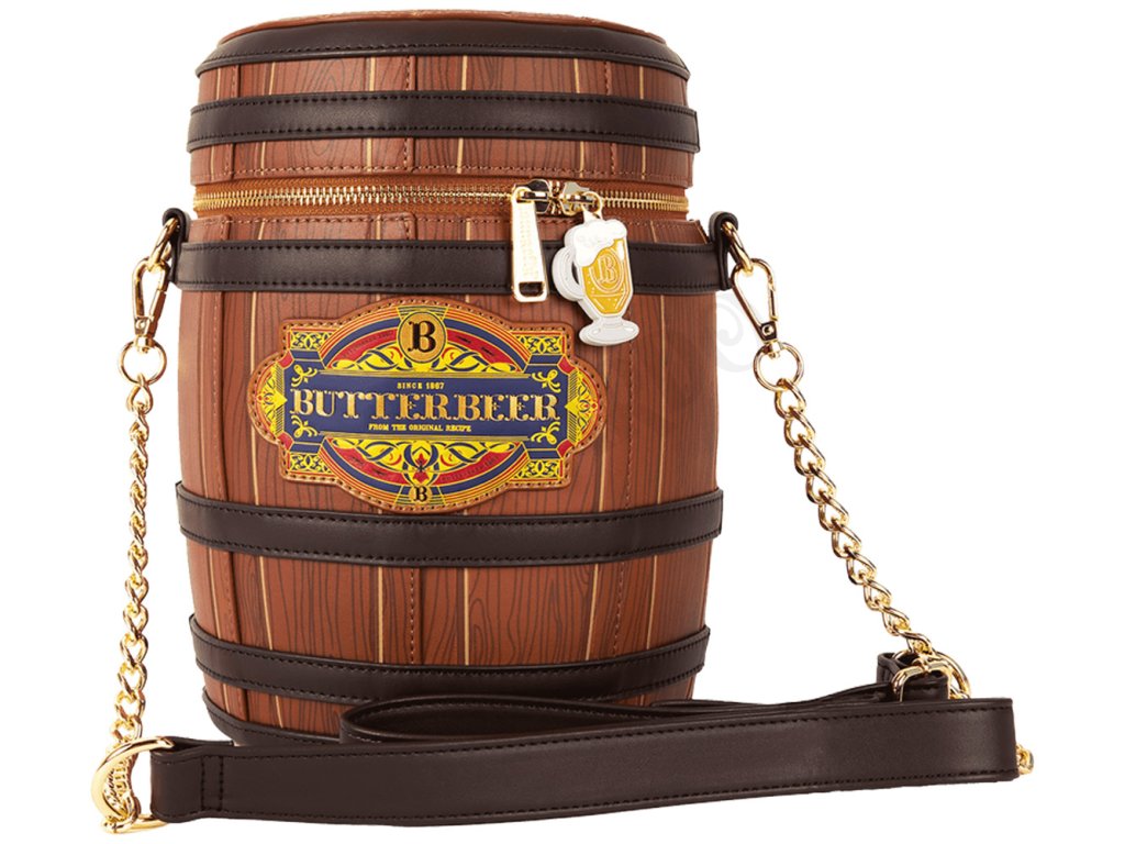 Na zdraví! Crossbody kabelka ve tvaru sudu Butterbeeru je z umělé kůže s dřevěnou texturou, která působí realisticky. Na přední straně a na horní části sudu najdete zlatou fólií vyvedené logo Butterbeeru a navíc skutečnou korkovou zátku!
