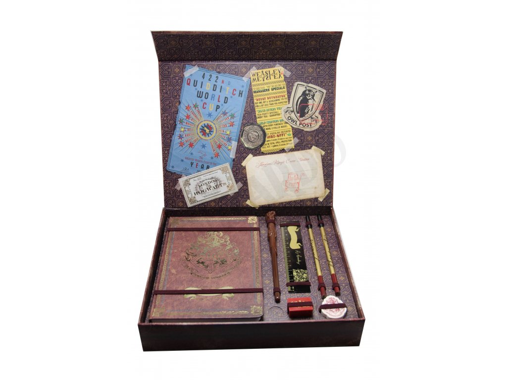 Krásný set, jako dárek luxusní. Krabička má zvenku potisk jako kufřík, je velmi pevná a zavírá se magneticky. Uvnitř je zápisník, propiska ve tvaru Harryho hůlky, pravítko, dvě tužky, guma, ořezávátko a když nadzvednete patro, najdete tam ještě dopisní papíry, obálky a nálepky jako pečetě.