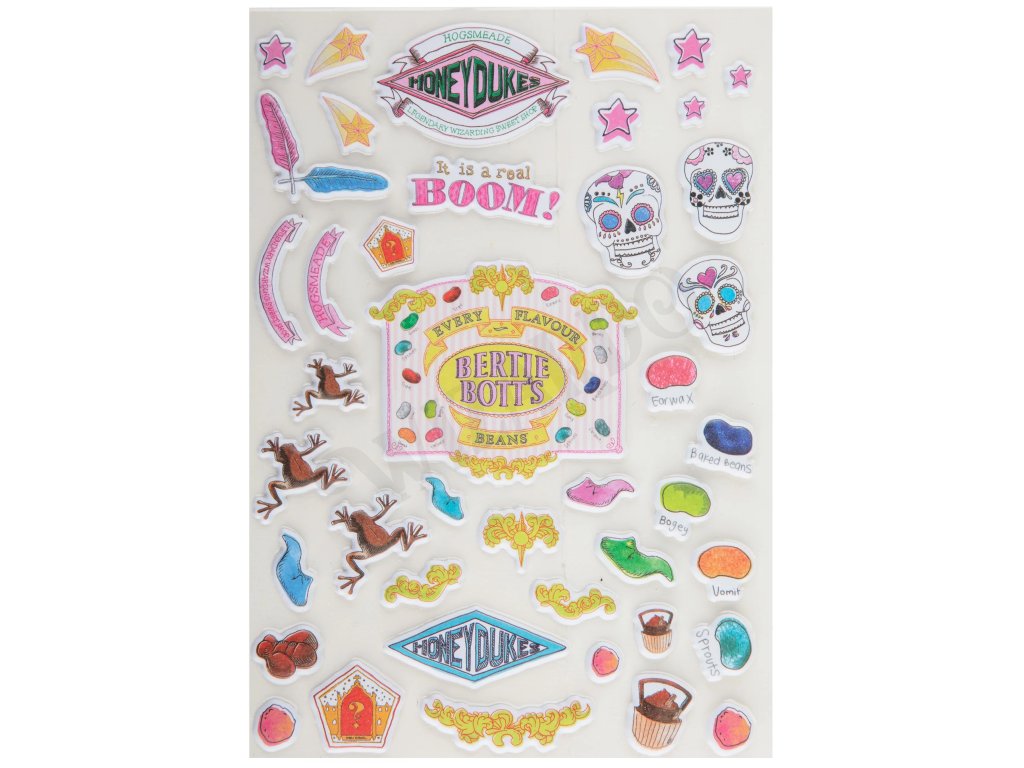 Sada "nafouknutých" samolepek s motivem dobrot a sladkostí z Medového ráje v Prasinkách jako je čokoládová žabka, bertíkovy fazolky tisíckrát jinak, cukrové brky a další!