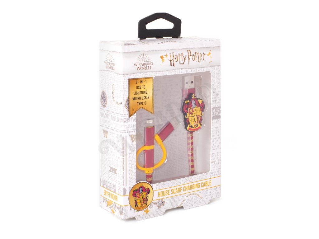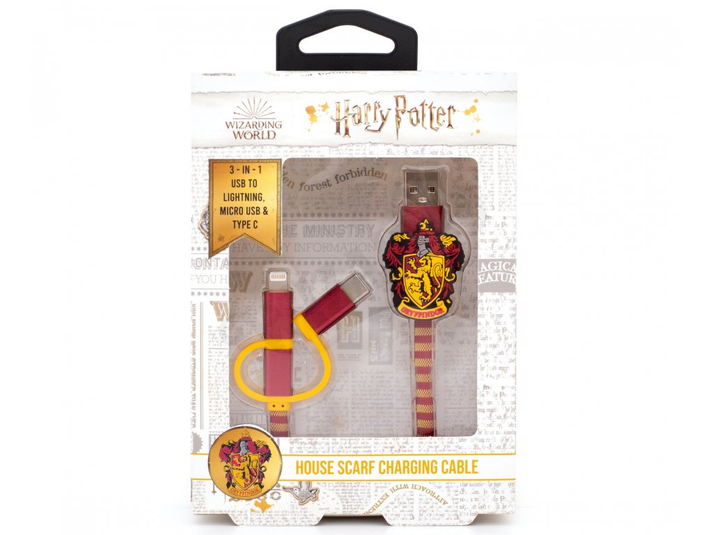 USB kabel 3v1 s konektory Micro USB, Lightning a USB-C (Type C) o délce 1m ve stylu nebelvírské školní šály a jejím kolejním znakem.