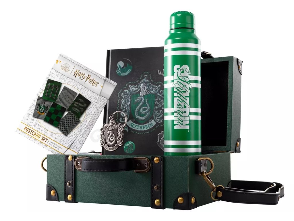 Produkty v sadě – zápisník, pohlednice, termohrnek a klíčenka – jsou vyrobené v jednotném stylu a balené v elegantní dárkové krabičce. Sada je vhodná jako praktický doplněk pro školu, práci nebo studijní kout a je perfektním tipem na dárek pro všechny hrdé příznivce Zmijozelu.