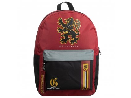 Kolejní batoh se znakem nebelvírské koleje a popruhem na zipu na přední kapse.