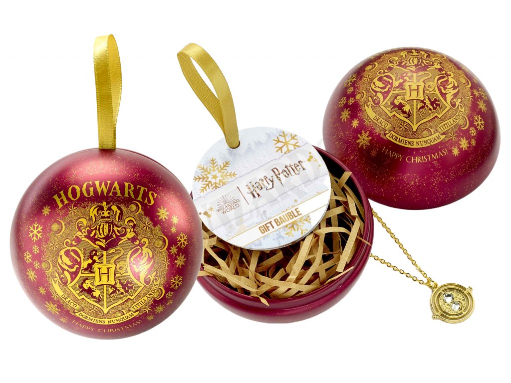 Vánoční ozdoba (koule) z kovu, která skrývá překvapení uvnitř v podobě řetízku s Obracečem času.