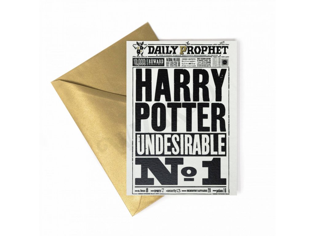 Originální přáníčko (12,5 x 17,2 cm) s motivem Denního Věštce s titulkem – Harry Potter, nežádoucí číslo jedna, z dílny MinaLima, tvůrců replik, které byly použity ve filmech o Harrym Potterovi.