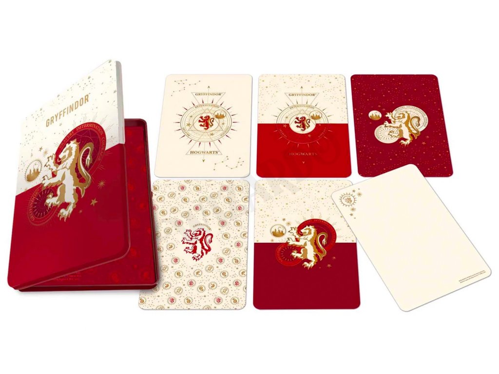 Sada 20 pohlednic v plechové krabičce s motivy bradavické koleje Nebelvír.