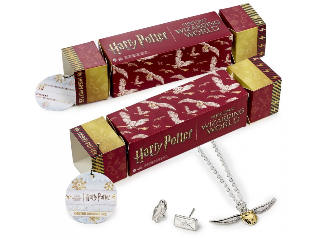 Harry Potter Christmas Gift Cracker (vánoční dárková krabička) s řetízkem a náušnicemi. Dárková krabička s motivy Hedviky obsahuje náušnice se tvaru dopisu a sovy Hedviky, a řetízek se zlatonkou.
