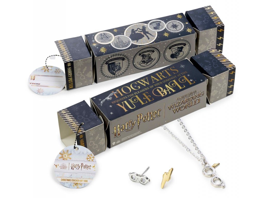 Harry Potter Christmas Gift Cracker (vánoční dárková krabička) s řetízkem a náušnicemi. Dárková krabička s motivy vánočního plesu v Bradavicích obsahuje náušnice ve tvaru brýlí a blesku, řetízek s brýlemi.