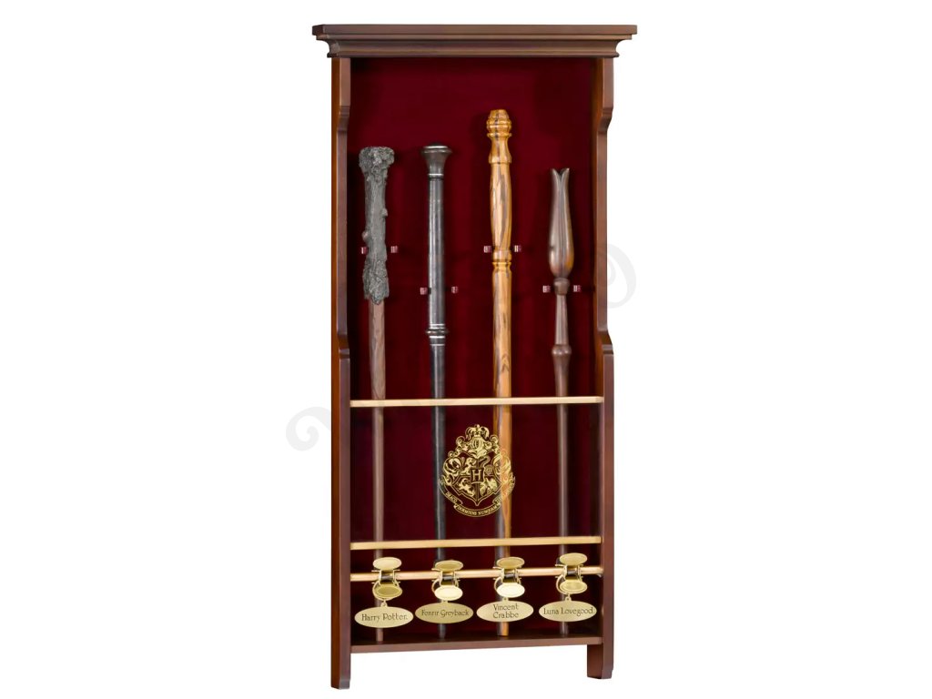 Elegantní stojan z lakovaného dřeva na čtyři kouzelnické hůlky, filmové repliky z Harry Potter filmů a Fantastických zvířat.